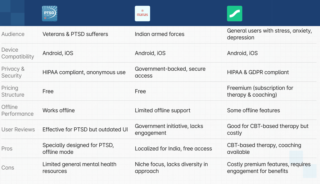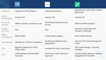 This analysis compares Manas, PTSD Coach, and Sanvello based on audience, features, privacy, pricing, and offline performance. Each app has unique strengths—Manas focuses on the Indian armed forces, PTSD Coach is specialized for trauma recovery, and Sanvello offers CBT-based therapy. Understanding these competitors helped identify opportunities for improvement, such as engagement strategies and accessibility.