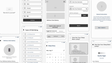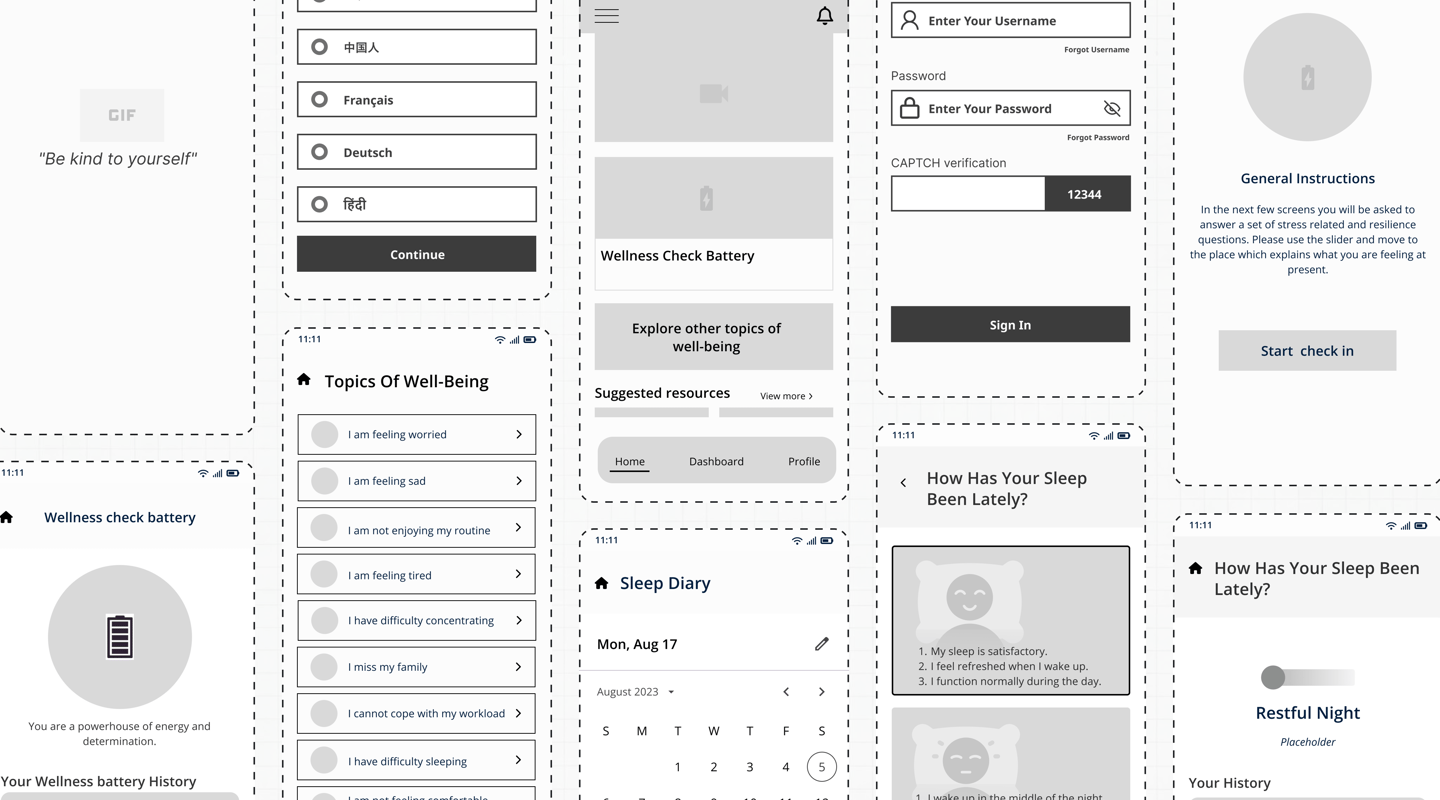 We created low-fidelity wireframes to map out the core user flows, ensuring intuitive navigation and seamless access to mental health resources.The wireframes focused on simplicity, accessibility, and efficiency, laying the foundation for a user-friendly experience before moving into high-fidelity designs.
