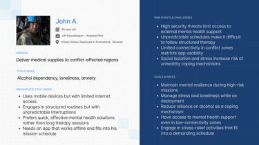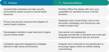UN peacekeepers often face high-stress environments and trauma, leading to mental health challenges such as PTSD, anxiety, and depression. However, limited awareness, stigma, and concerns about confidentiality prevent them from seeking necessary support. Many worry about career consequences or feel uncertain about where to seek help. Additionally, those who do receive assistance struggle to track their progress, making it difficult to gauge improvements and maintain their well-being effectively.
