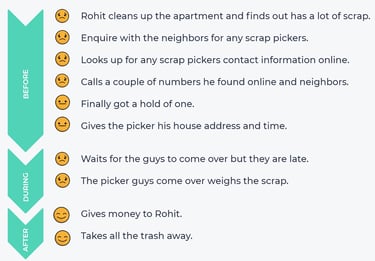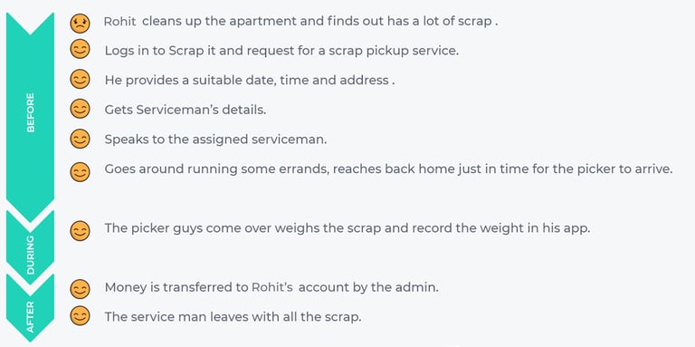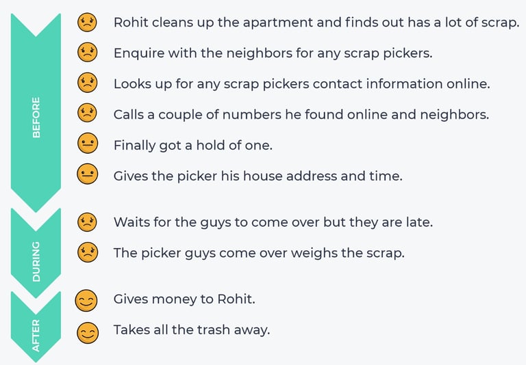 Rohit did not want to discard the items irresponsibly on the roadside. He had to rely on neighbors for information and make multiple phone calls to reach scrap collectors, often waiting a long time for a response. The lack of a reliable and structured way to manage scrap disposal made the process time-consuming and frustrating.